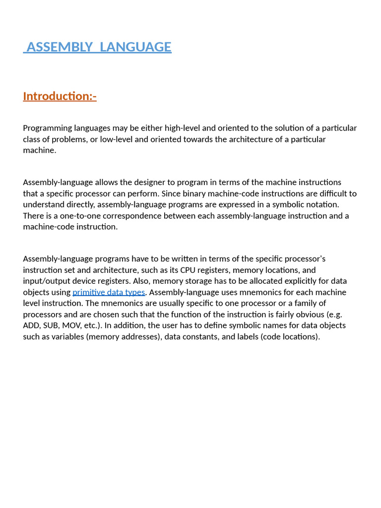 objects using primitive data types. Assembly-language uses mnemonics for each machine