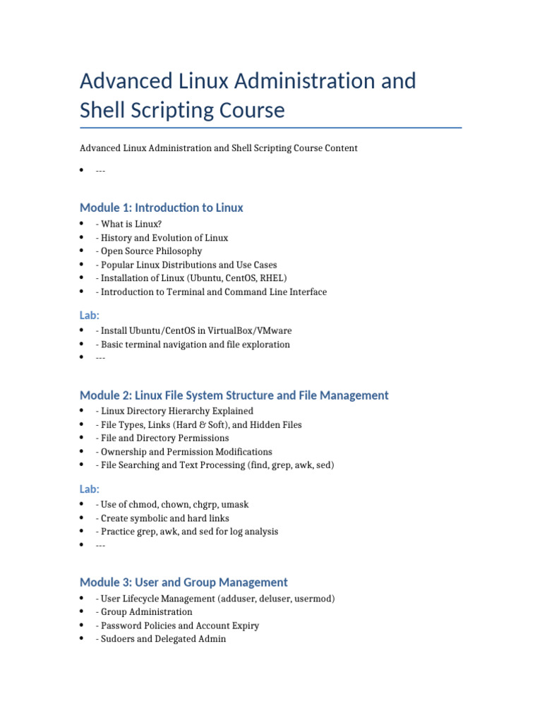 - Installation of Linux (Ubuntu, CentOS, RHEL)