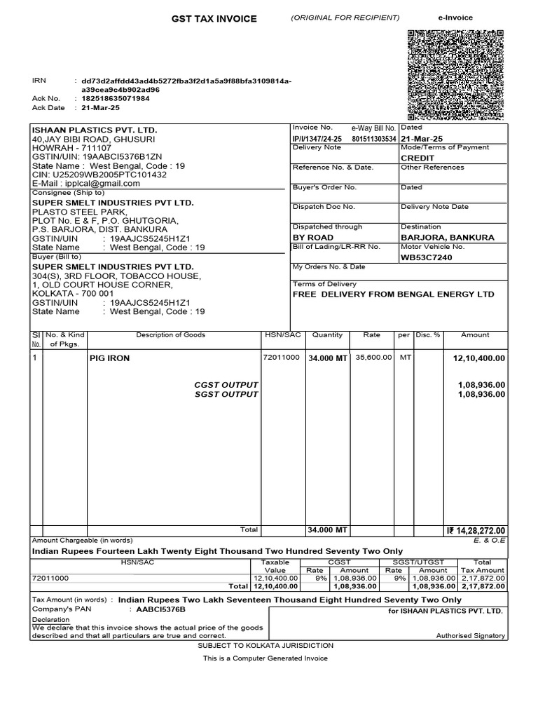ISHAAN PLASTICS PVT. LTD. Invoice No. e-Way Bill No. Dated