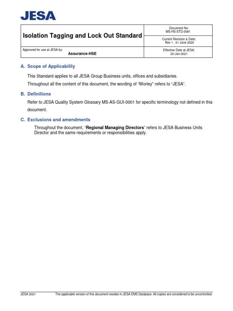 This Standard applies to all JESA Group Business units, offices and subsidiaries.