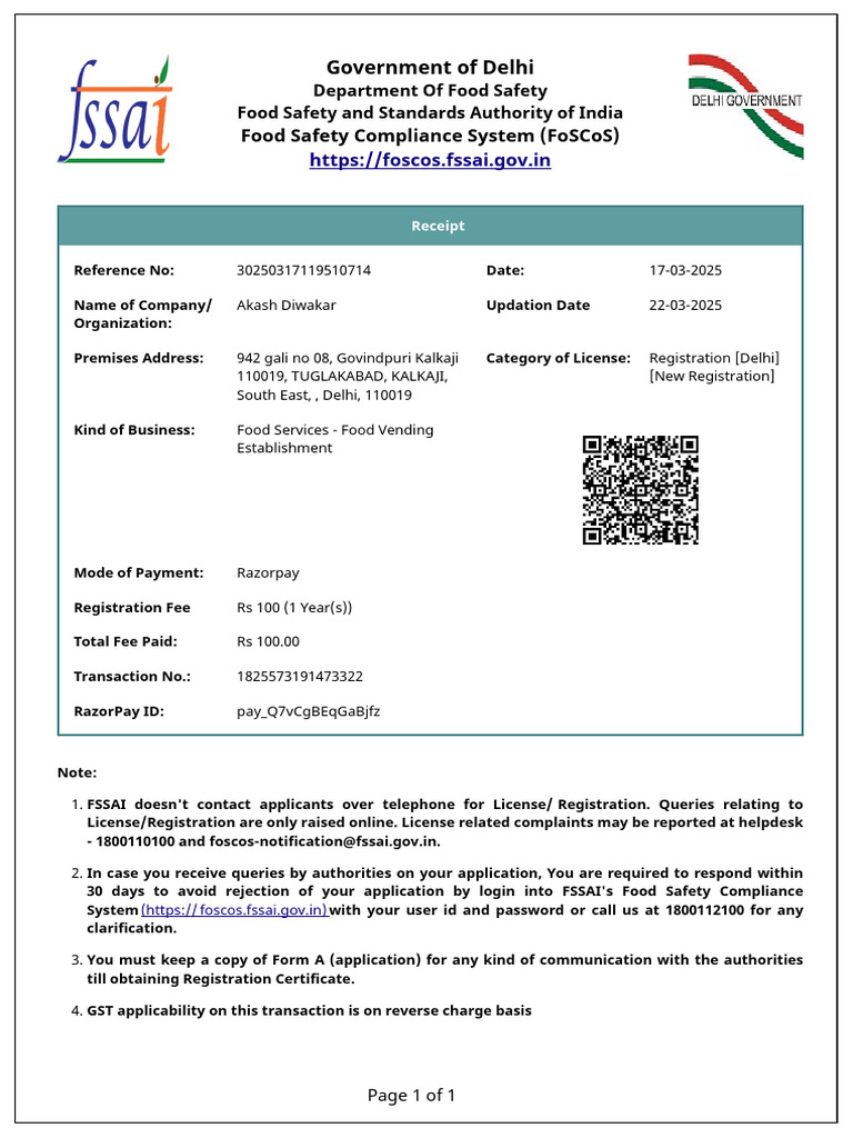 Premises Address: 942 gali no 08, Govindpuri Kalkaji Category of License: Registration [Delhi]