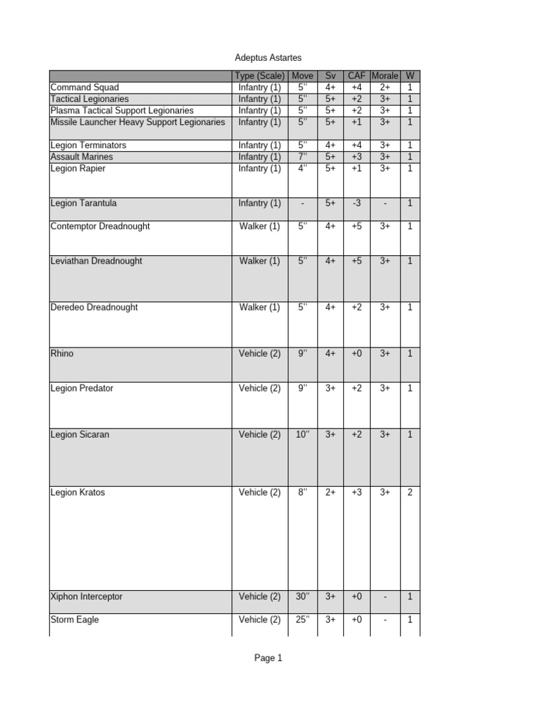 Type (Scale) Move Sv CAF Morale W