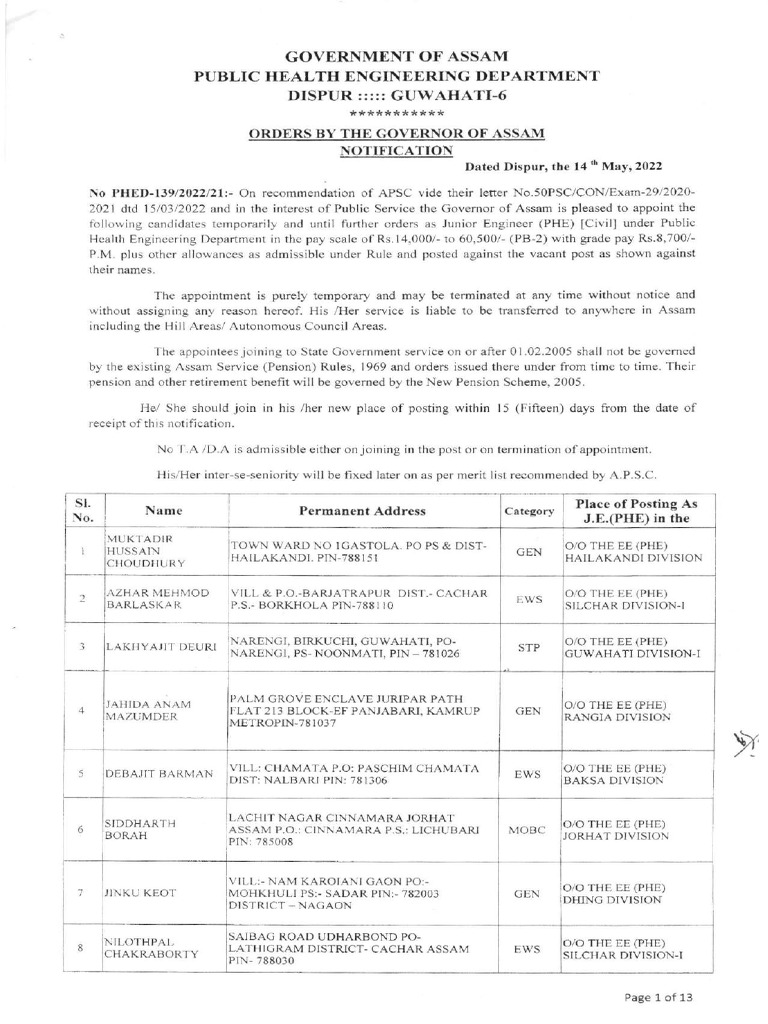 Assam Junior Engineer Appointment Notification