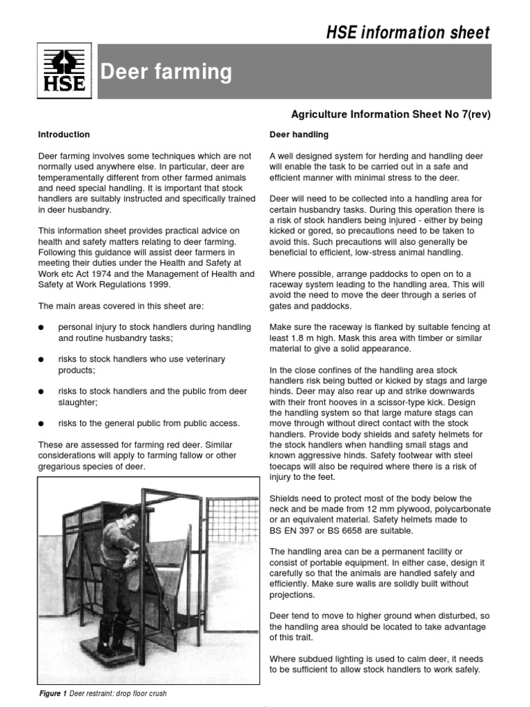 Introduction Deer farming involves some techniques which are not normally used anywhere else. In particular, deer are temperamentally different from other farmed animals and need special handling. It is important that stock handlers are suitably instructed and specifically trained in deer husbandry. This information sheet provides practical advice on health and safety matters relating to deer farming. Following this guidance will assist deer farmers in meeting their duties under the Health and Safety at Work etc Act 1974 and the Management of Health and Safety at Work Regulations 1999. The main areas covered in this sheet are: