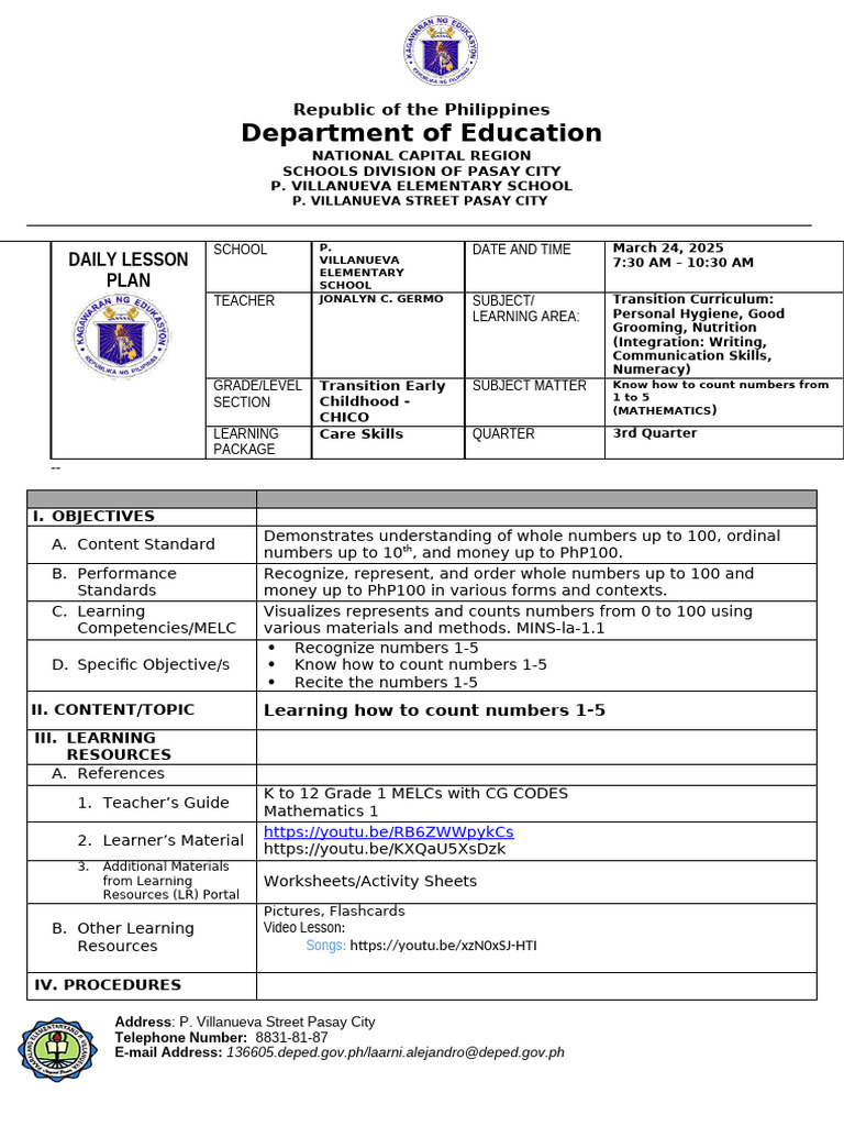 D. Specific Objective/s Know how to count numbers 1-5
