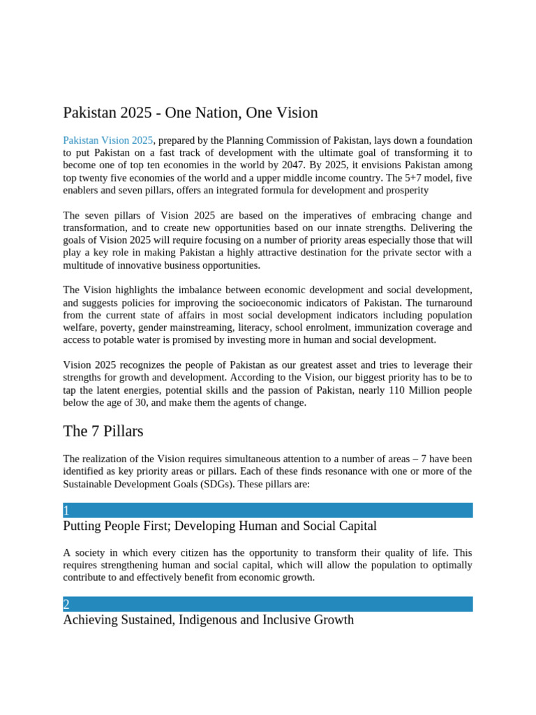 Pakistan Vision 2025, prepared by the Planning Commission of Pakistan, lays down a foundation