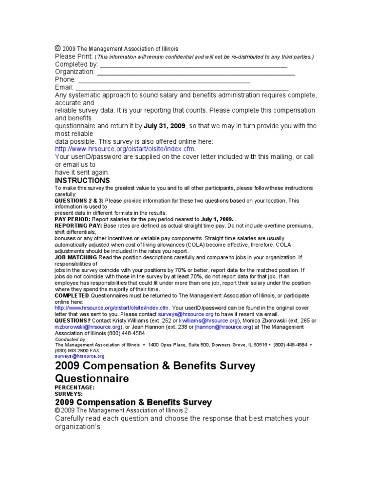 To make this survey the greatest value to you and to all other participants, please follow these instructions carefully: QUESTIONS 2 & 3: Please provide information for these two questions based on your location. This information is used to present data in different formats in the results. PAY PERIOD: Report salaries for the pay period nearest to July 1, 2009. REPORTING PAY: Base rates are defined as actual straight time pay. Do not include overtime premiums, shift differentials, bonuses or any other incentives or variable pay components. Straight time salaries are usually automatically adjusted when cost of living allowances (COLA) become effective, therefore, COLA adjustments should be included in the rates you report. JOB MATCHING Read the position descriptions carefully and compare to jobs in your organization. If responsibilities of jobs in the survey coincide with your positions by 70% or better, report data for the matched position. If jobs do not coincide with those in the survey by at least 70%, do not report data for that job. If an employee has responsibilities that could fit under more than one job, report their salary under the position where they spend the majority of their time. COMPLETED Questionnaires must be returned to The Management Association of Illinois, or participate online here: http://www.hrsource.org/olstart/olsite/index.cfm. Your userID/password can be found in the original cover letter that was sent to you. Please contact surveys@hrsource.org to have it resent via email. QUESTIONS? Contact Kristy Williams (ext. 252 or kwilliams@hrsource.org), Monica Zborowski (ext. 265 or mzborowski@hrsource.org), or Jean Hannon (ext. 238 or jhannon@hrsource.org) at The Management Association of Illinois (800) 448-4584.