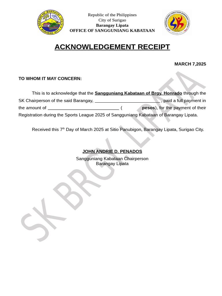 This is to acknowledge that the Sangguniang Kabataan of Brgy. Honrado through the