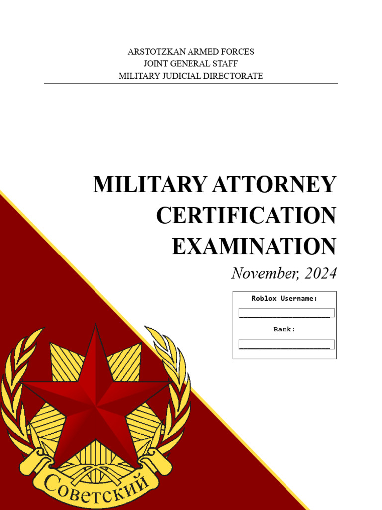 You are about to begin the examination for the Military Attorney Certification. Successfully passing this