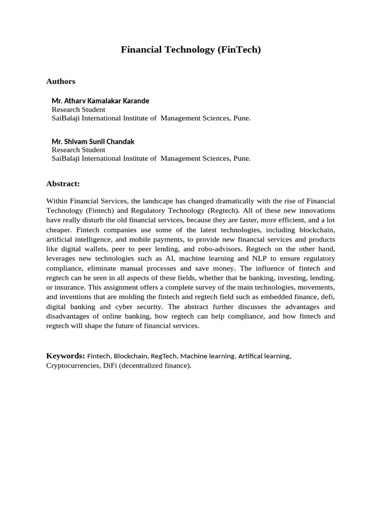 Keywords: Fintech, Blockchain, RegTech, Machine learning, Artifical learning,