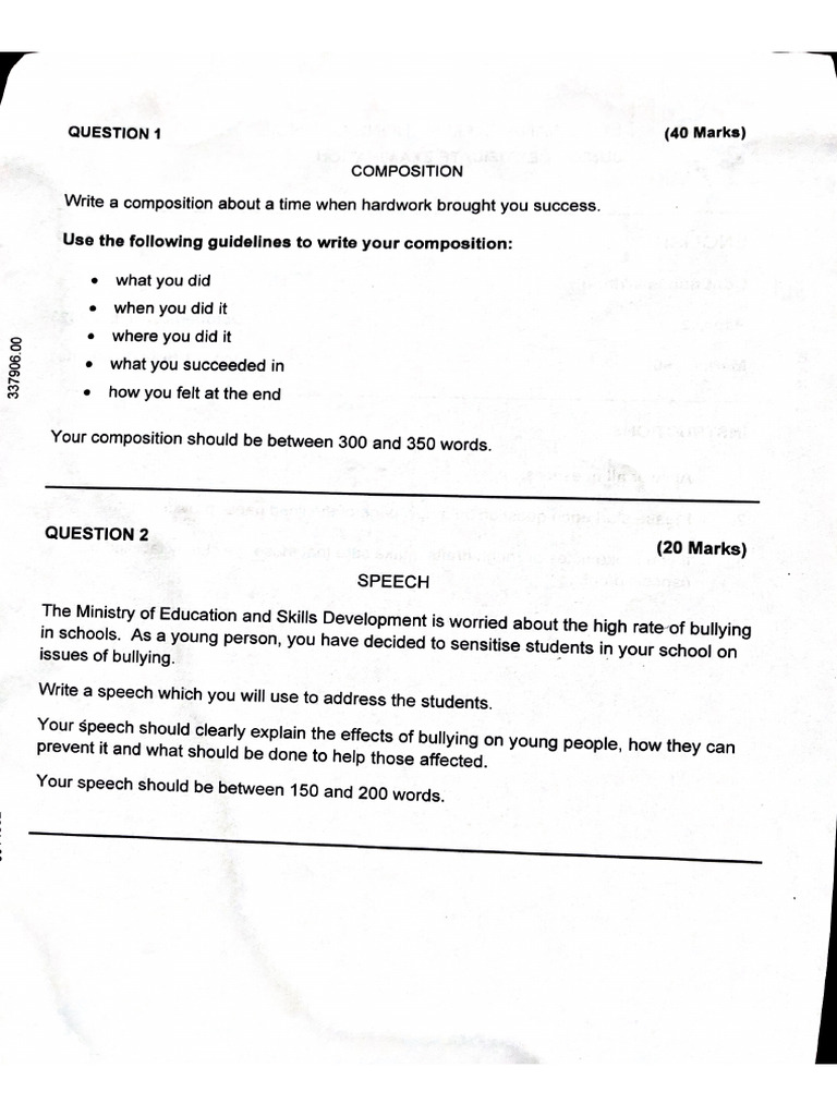 The document outlines various writing tasks for students, including compositions and letters, each with specific guidelines and word limits. Topics range from personal experiences, such as celebrations and journeys, to social issues like bullying and environmental health. Each task is assigned a mark value, indicating its importance in the assessment.