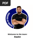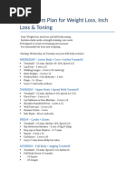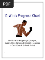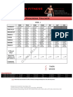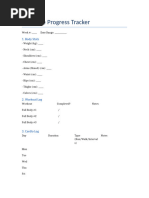 The document is a Calories & Progress Tracker template for individuals to log their daily and weekly fitness data. It includes fields for calories consumed, macronutrient breakdown, water intake, workout completion, steps taken, weight, inches lost, and strength progress. Additionally, it features a weekly scoreboard to track weight change, inches lost, consistency score, and overall strength progress.
