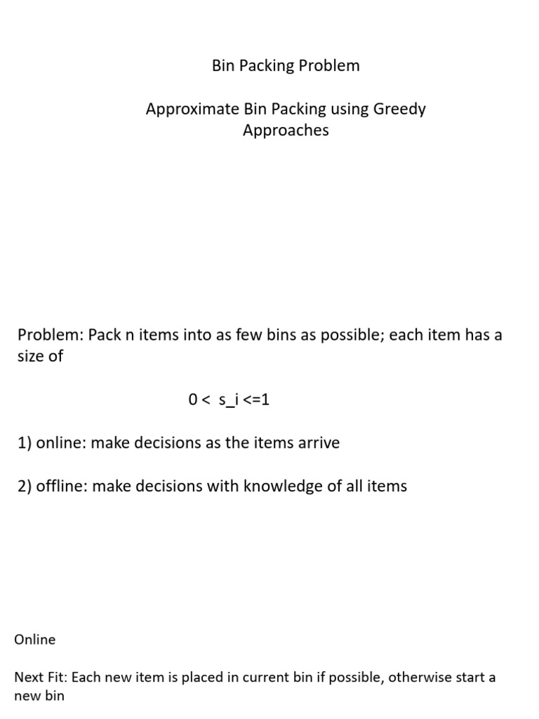 Next Fit: Each new item is placed in current bin if possible, otherwise start a