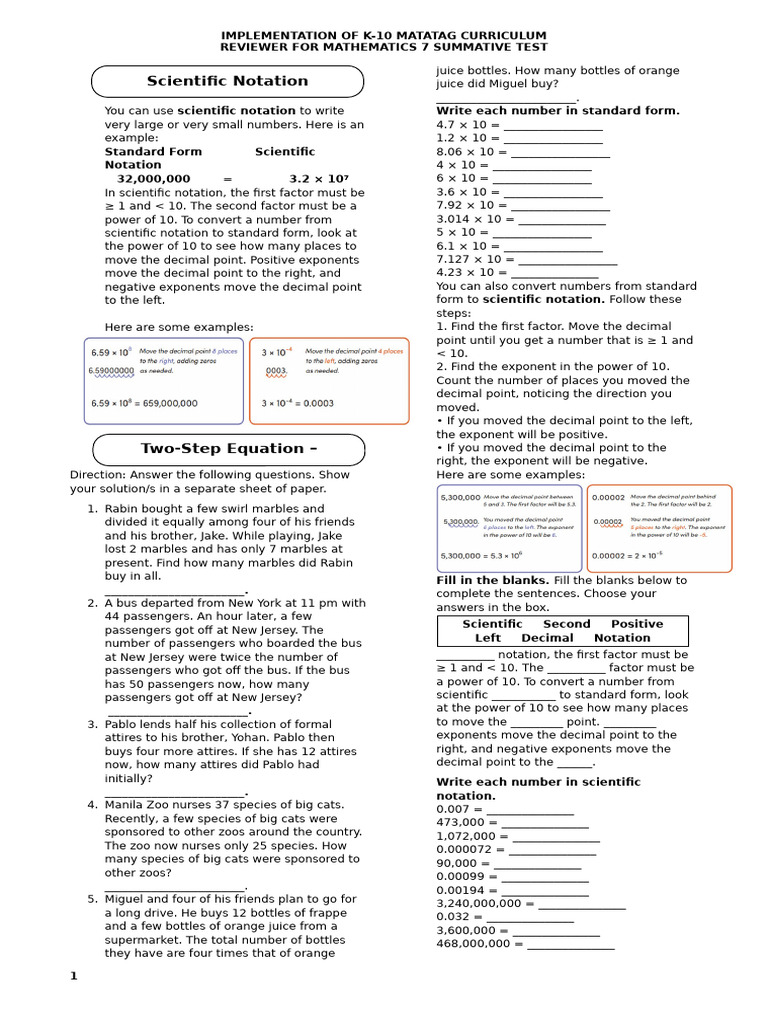 REVIEWER FOR MATHEMATICS 7 SUMMATIVE TEST