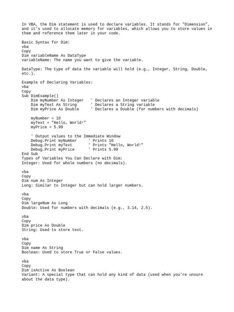 Basic Syntax for Dim: