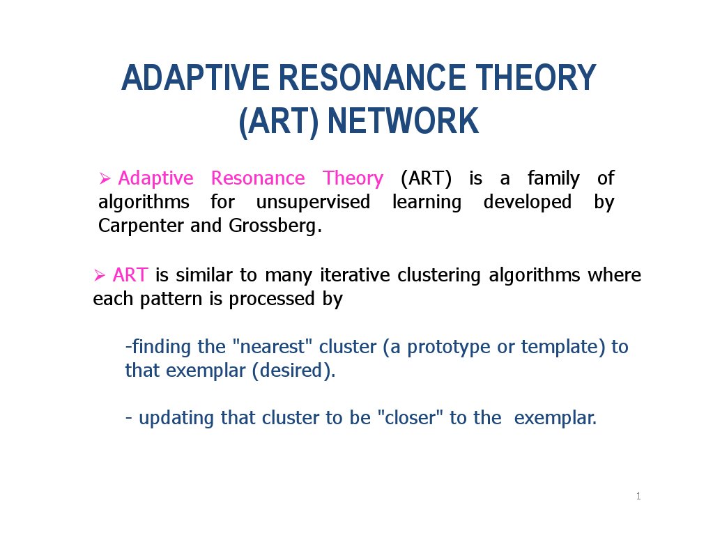 Adaptive Resonance Theory (ART) is a family of algorithms for unsupervised learning developed by Carpenter and Grossberg. ART is similar to many iterative clustering algorithms where each pattern is processed by -finding the "nearest" cluster (a prototype or template) to that exemplar (desired). - updating that cluster to be "closer" to the exemplar.