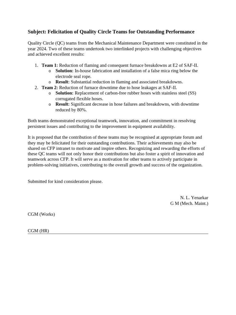 Subject: Felicitation of Quality Circle Teams for Outstanding Performance