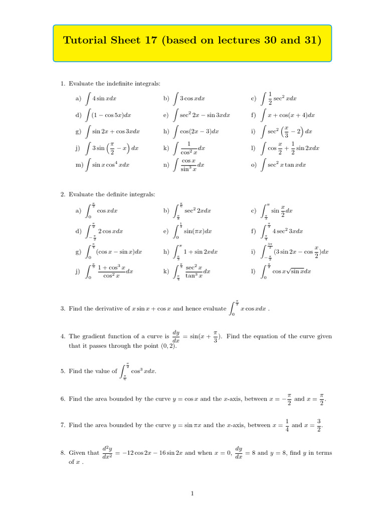 d) 2 cos xdx e) sin(πx)dx f) 4 sec2 3xdx