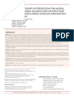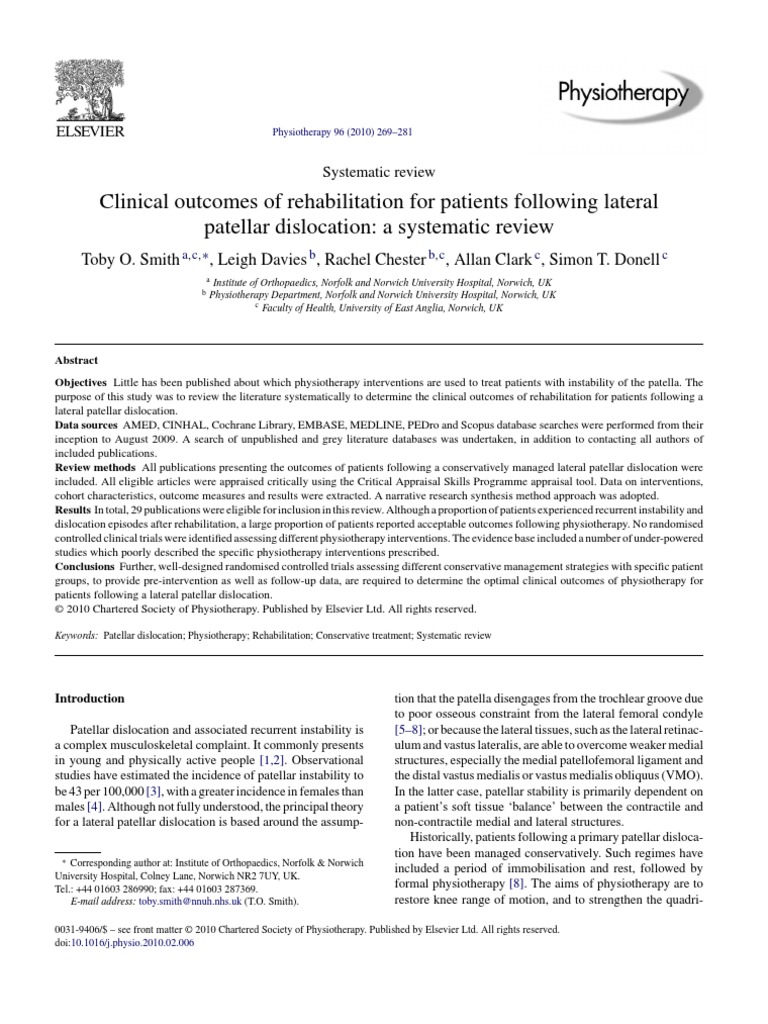 Abstract Objectives Little has been published about which physiotherapy interventions are used to treat patients with instability of the patella. The purpose of this study was to review the literature systematically to determine the clinical outcomes of rehabilitation for patients following a lateral patellar dislocation. Data sources AMED, CINHAL, Cochrane Library, EMBASE, MEDLINE, PEDro and Scopus database searches were performed from their inception to August 2009. A search of unpublished and grey literature databases was undertaken, in addition to contacting all authors of included publications. Review methods All publications presenting the outcomes of patients following a conservatively managed lateral patellar dislocation were included. All eligible articles were appraised critically using the Critical Appraisal Skills Programme appraisal tool. Data on interventions, cohort characteristics, outcome measures and results were extracted. A narrative research synthesis method approach was adopted. Results In total, 29 publications were eligible for inclusion in this review. Although a proportion of patients experienced recurrent instability and dislocation episodes after rehabilitation, a large proportion of patients reported acceptable outcomes following physiotherapy. No randomised controlled clinical trials were identied assessing different physiotherapy interventions. The evidence base included a number of under-powered studies which poorly described the specic physiotherapy interventions prescribed. Conclusions Further, well-designed randomised controlled trials assessing different conservative management strategies with specic patient groups, to provide pre-intervention as well as follow-up data, are required to determine the optimal clinical outcomes of physiotherapy for patients following a lateral patellar dislocation. 2010 Chartered Society of Physiotherapy. Published by Elsevier Ltd. All rights reserved.