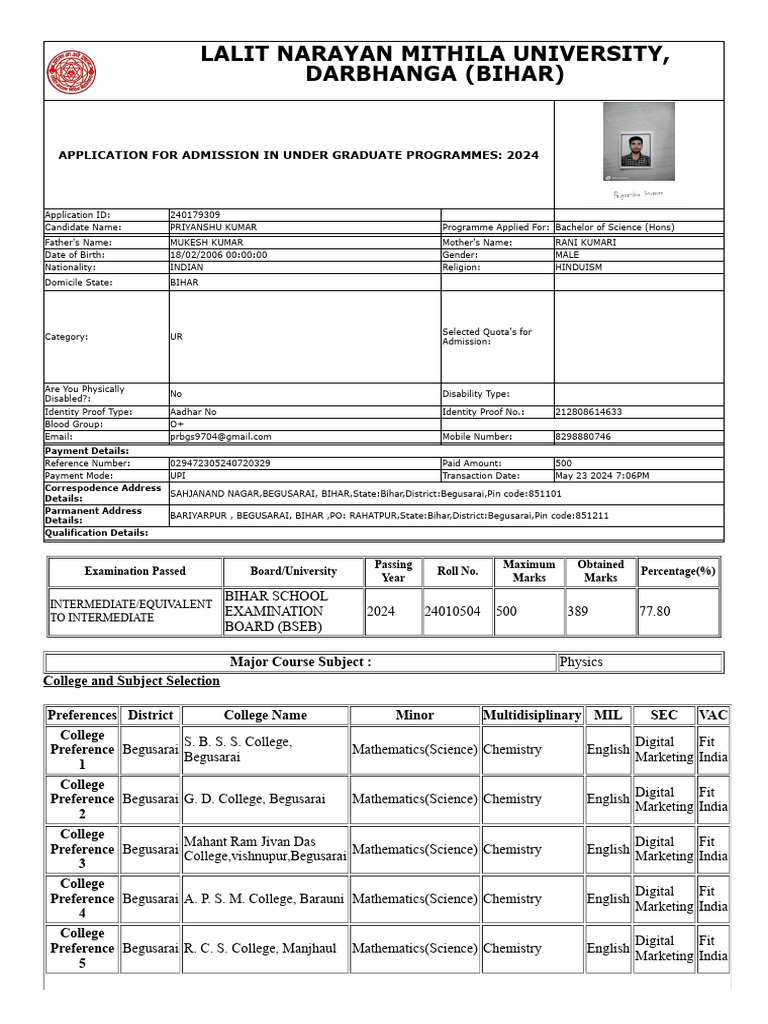 Candidate Name: PRIYANSHU KUMAR Programme Applied For: Bachelor of Science (Hons)