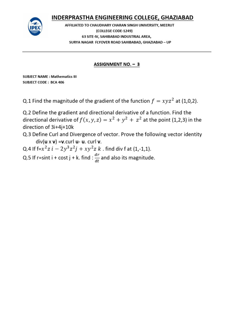 Q.4 If f=𝑥 𝑧 𝑖 − 2𝑦 𝑧 𝑗 + 𝑥𝑦 𝑧 𝑘 . find div f at (1,-1,1).