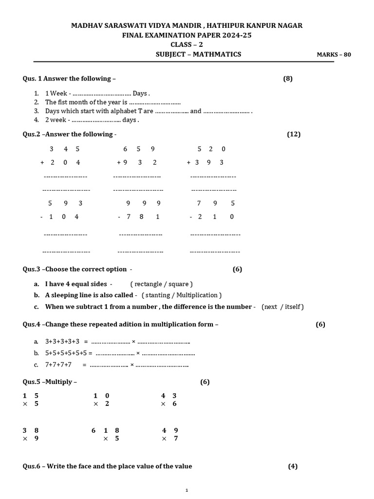SUBJECT – MATHMATICS MARKS – 80