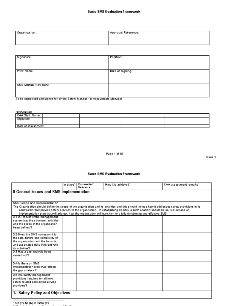 SMS Scope and Implementation The Organisation should define the scope of the organisation and its activities and this should include how it addresses safety provisions in its contractors that provide safety services to the organisation. In establishing an SMS a GAP analysis should be carried out and an implementation plan that will address how the organisation will transition to a fully functioning and effective SMS 0.1 In respect of the management system has the structure, activities and the scope of the organisation been defined? 0.2 Does the SMS correspond to the size, nature and complexity of the organisation and the hazards and associated risks inherent with its activities? 0.3 Has a gap analysis been carried out? 0.4 Is there an SMS implementation plan that reflects the gap analysis? 0.5 Are safety management provisions required for all new safety related contracted service providers?