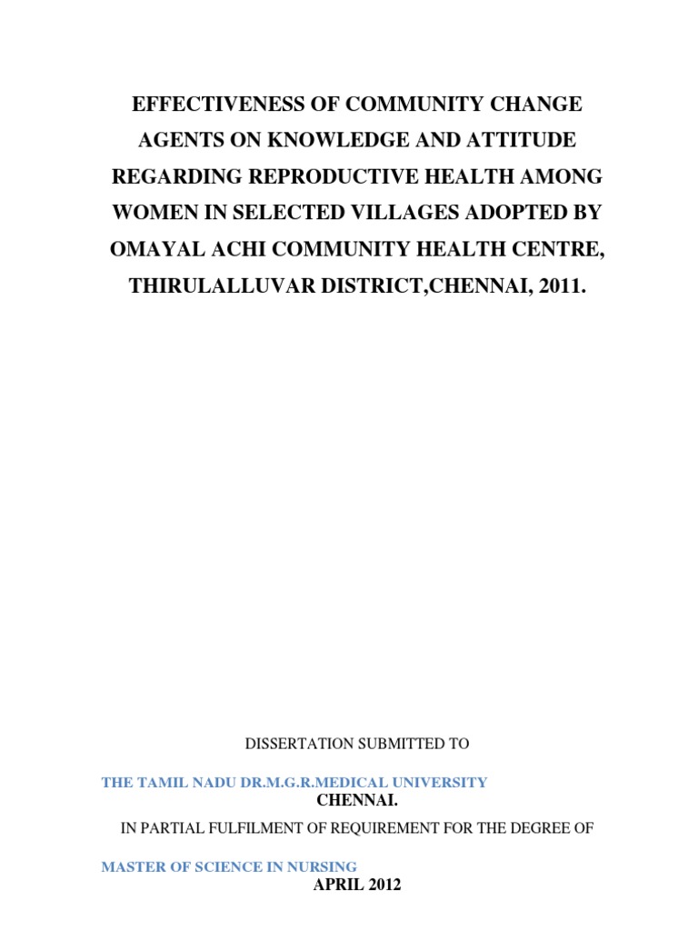 EFFECTIVENESS OF COMMUNITY CHANGE AGENTS ON KNOWLEDGE AND ATTITUDE REGARDING REPRODUCTIVE HEALTH AMONG WOMEN IN SELECTED VILLAGES ADOPTED BY OMAYAL ACHI COMMUNITY HEALTH CENTRE, THIRULALLUVAR DISTRICT, CHENNAI, 2011.