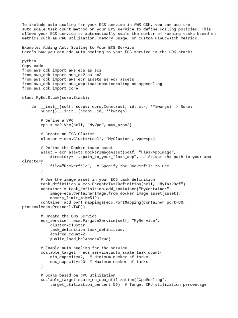 To include auto scaling for your ECS service in AWS CDK, you can use the