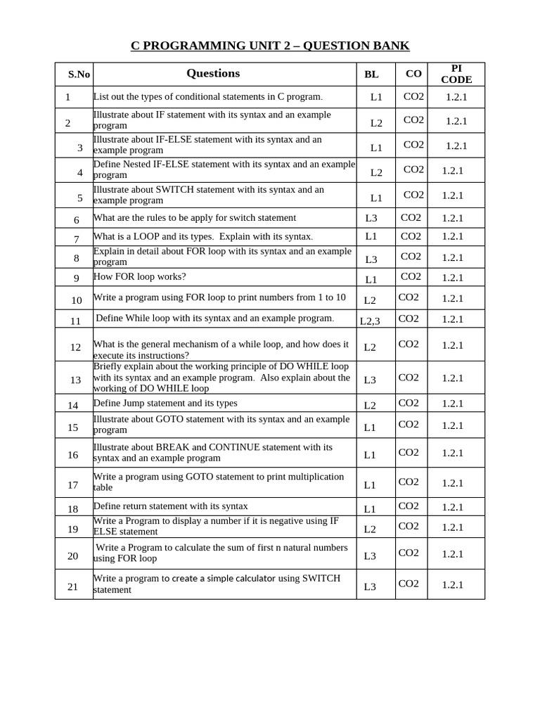 1 List out the types of conditional statements in C program. L1 CO2 1.2.1