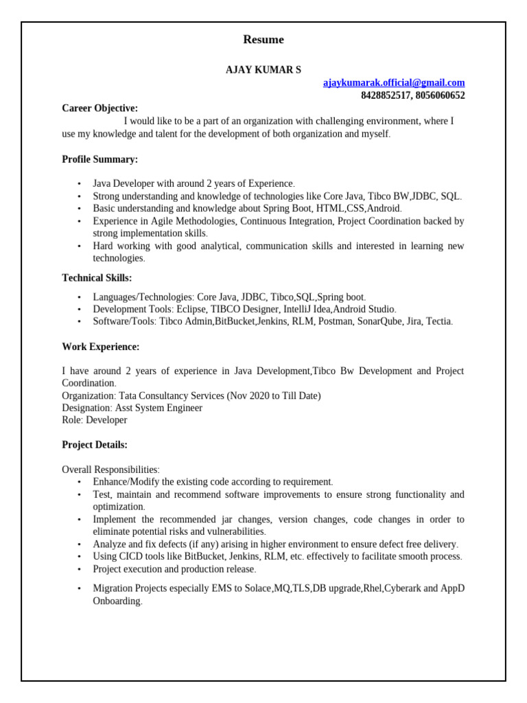 I have around 2 years of experience in Java Development,Tibco Bw Development and Project