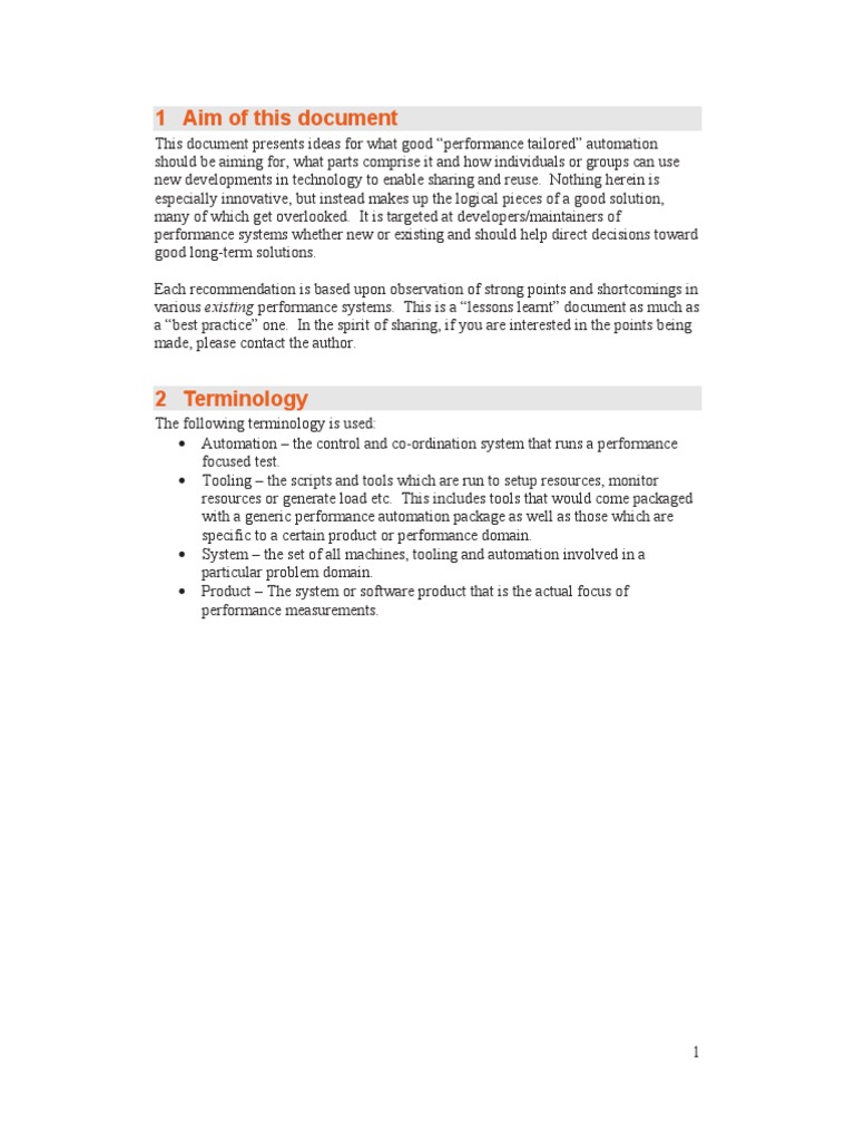 The following terminology is used: Automation the control and co-ordination system that runs a performance focused test. Tooling the scripts and tools which are run to setup resources, monitor resources or generate load etc. This includes tools that would come packaged with a generic performance automation package as well as those which are specific to a certain product or performance domain. System the set of all machines, tooling and automation involved in a particular problem domain. Product The system or software product that is the actual focus of performance measurements.