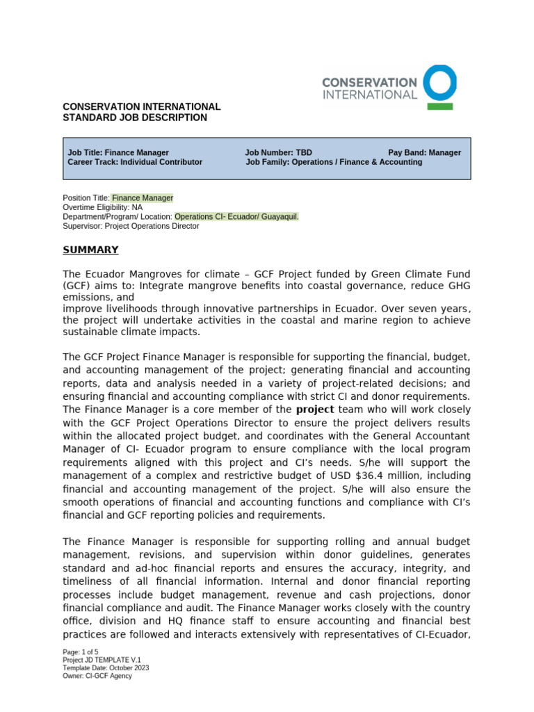 Department/Program/ Location: Operations CI- Ecuador/ Guayaquil.
