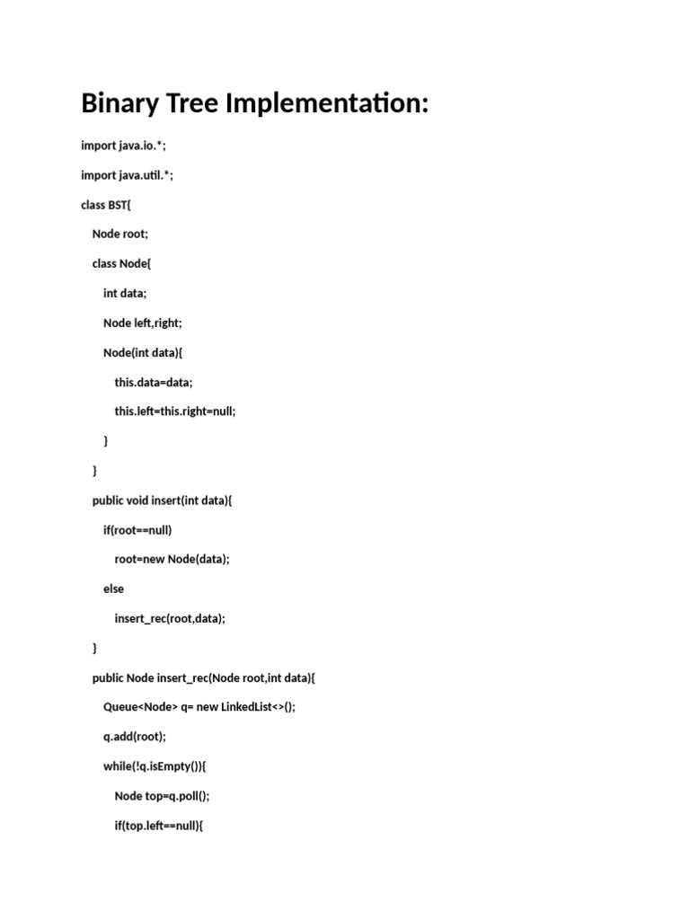 Binary Tree Implementation: