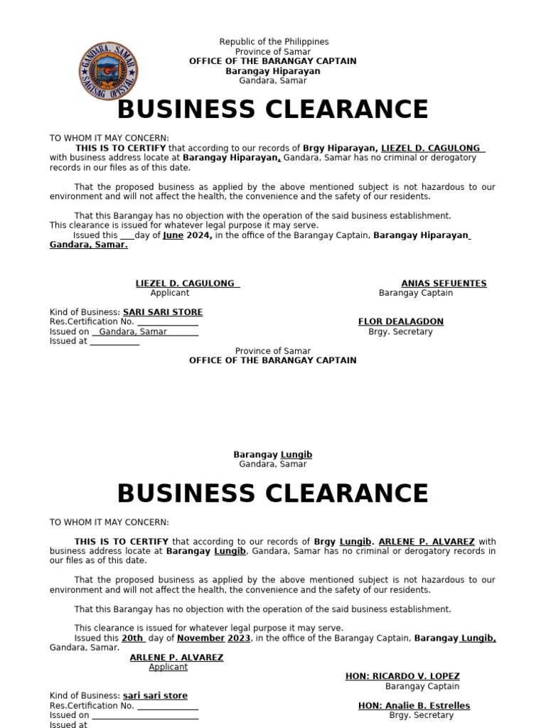 with business address locate at Barangay Hiparayan, Gandara, Samar has no criminal or derogatory