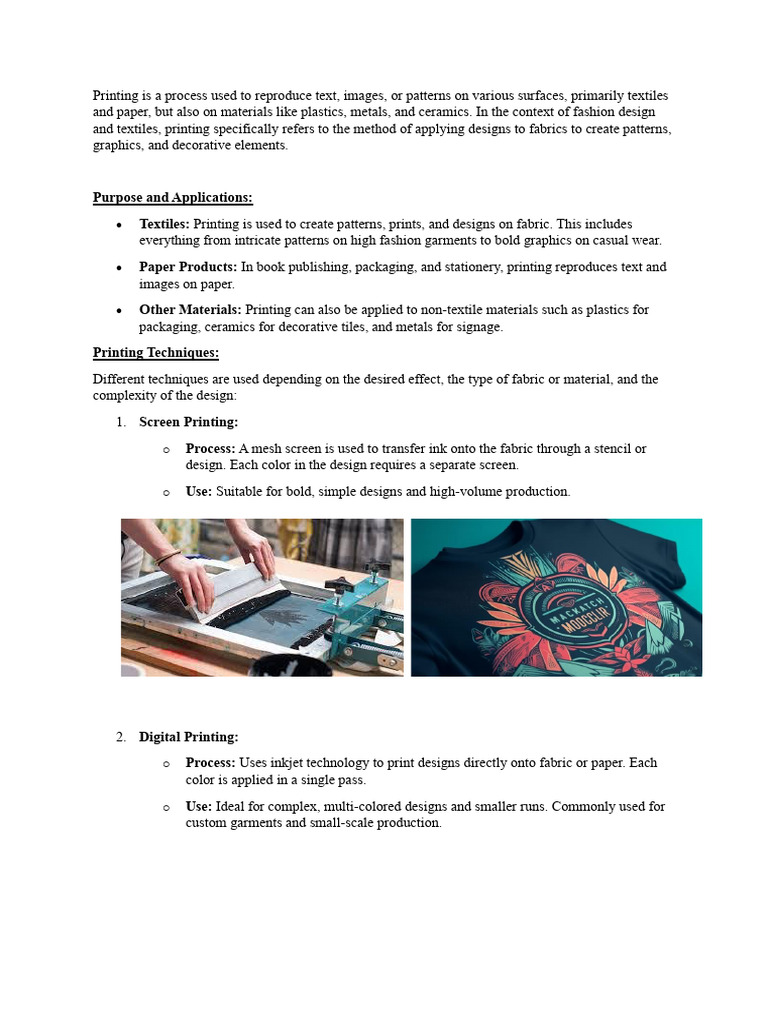 Printing is a process used to reproduce text, images, or patterns on various surfaces, primarily textiles