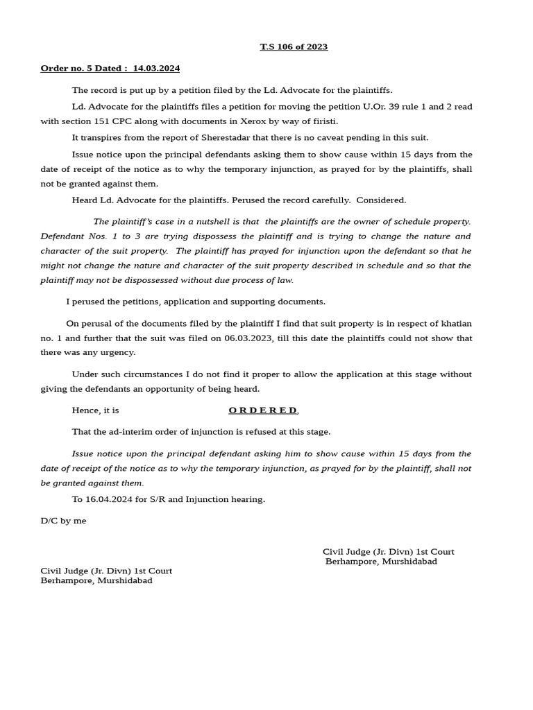 Ld. Advocate for the plaintiffs files a petition for moving the petition [Link]. 39 rule 1 and 2 read