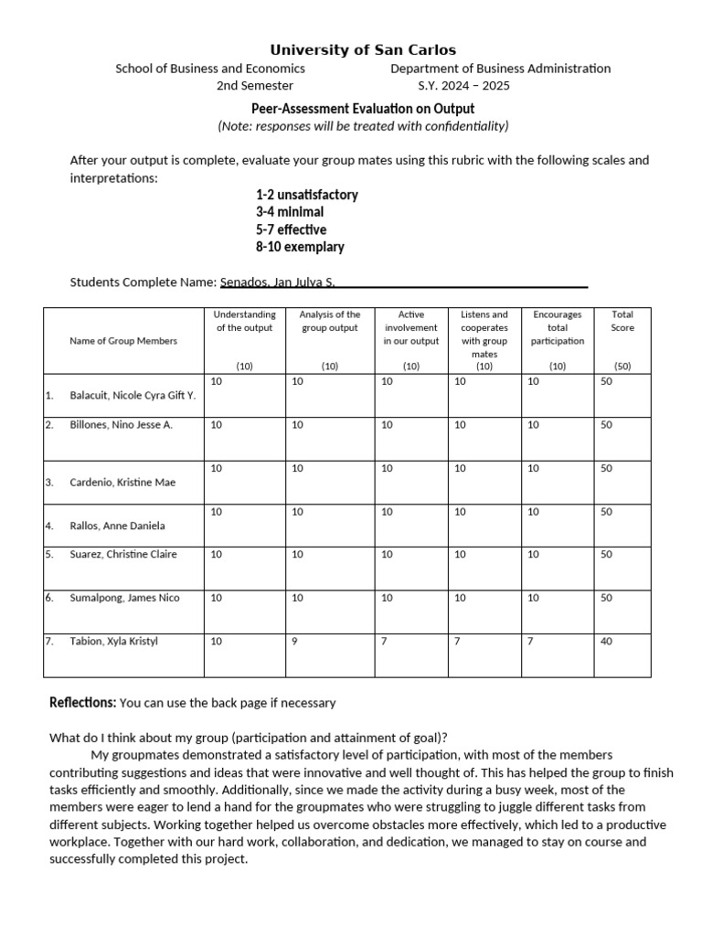 After your output is complete, evaluate your group mates using this rubric with the following scales and