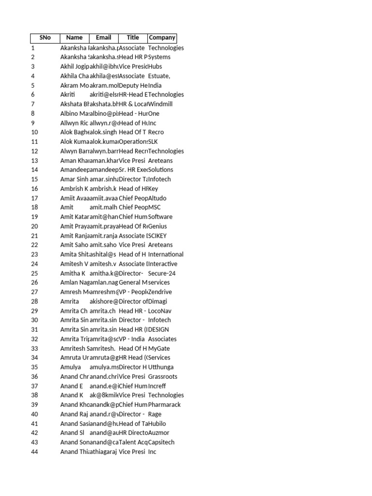 SNo Name Email Title Company