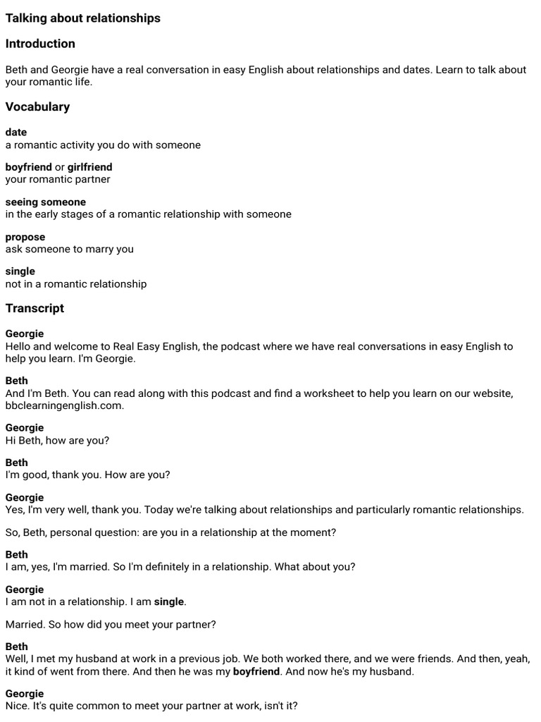 Beth and Georgie have a real conversation in easy English about relationships and dates. Learn to talk about