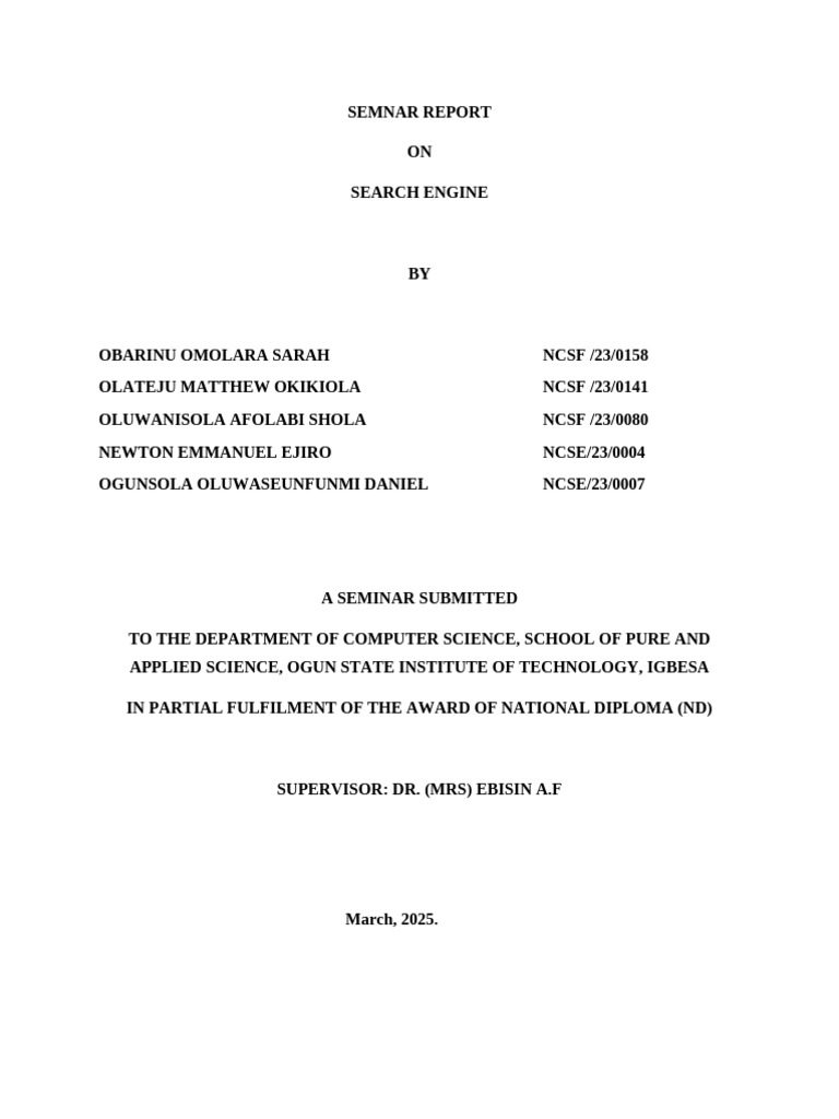 This is to certify that this seminar work; SEARCH ENGINE is carried out by OBARINU