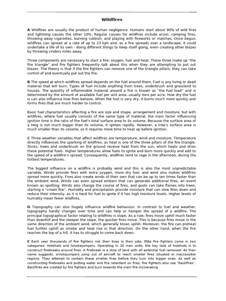 B The speed at which wildfires spread depends on the fuel around them. Fuel is any living or dead