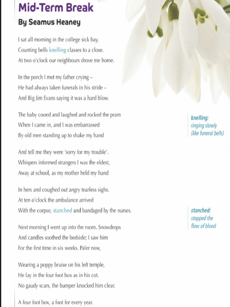 * Inthe final stanza Heaney visits his brother who is laid out peacefully. Heaney