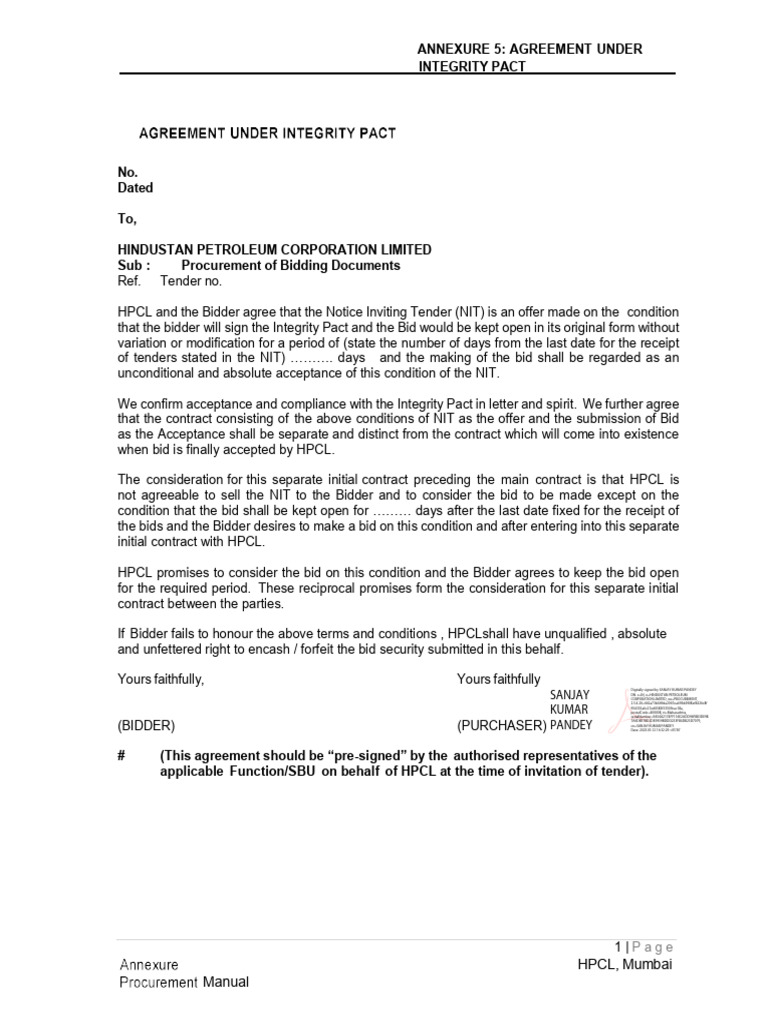 that the bidder will sign the Integrity Pact and the Bid would be kept open in its original form without