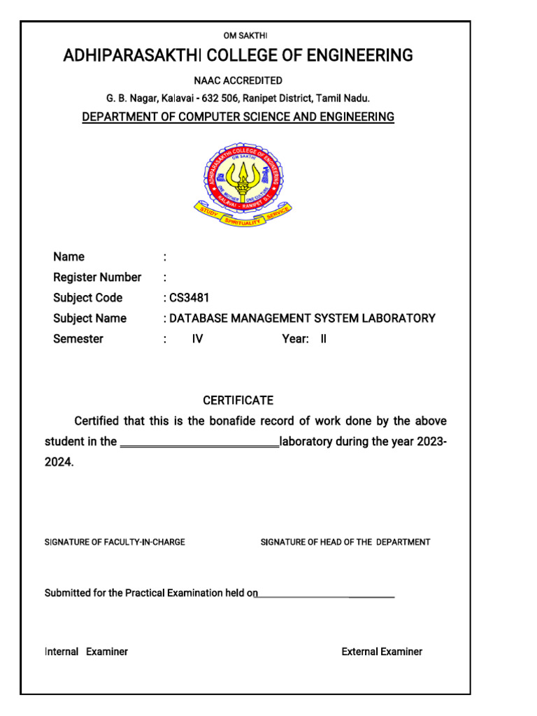 Subject Name : DATABASE MANAGEMENT SYSTEM LABORATORY