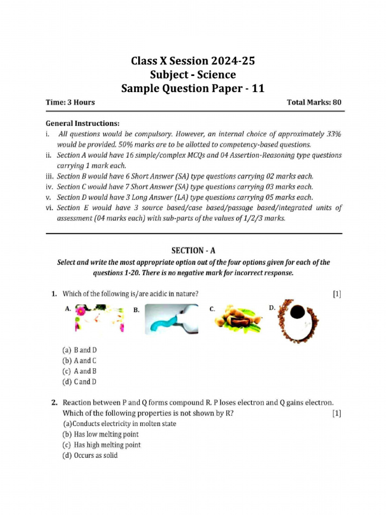 The document is a sample question paper for Class X Science for the session 2024-25, consisting of various sections including multiple-choice questions, short answer questions, and long answer questions, totaling 80 marks. It emphasizes competency-based assessments and includes internal choices for approximately 33% of the questions. The paper covers a wide range of topics in science, including chemistry, biology, and physics.