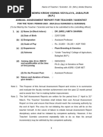 PartI. Evaluation of Senior Scientist (RGP 9000) who is mainly involved in Research Assessment period 3 years A A01 CORE ACTIVITIES SCIENTISTS ACHIEVEMENTS IN RESEARCH Institute projects. 3.0 marks for PI, 1.5 marks for Co-PI for every completed year (Max 12 marks) External projects of minimum 10 lakh per project: 3.0 marks for PI, 1.5 marks for Co-PI for every completed year. Innovative technologies developed, participatory technology developed, prototype, genetic stock, variety, product, vaccine, diagnostic kit, process, concept, methodology, software development/Data base management/Expert system developed/Decision support system /models / e-learning lessons / models developed & any other relevant output.: 4 marks for PI, 3 marks for Co-PI for each output Patents: For PI and Co-PI, for each patent granted 2 marks; for technology commercialized/popularized(without patent) 3 marks and for patent granted and commercialized/popularized: 5 marks Technology spread and impact across the system The variety released entered into seed chain . 3 marks Wide spread adoption of the variety /planting materials /tools / machinery / technology developed etc. by the farmers / clients across the system / country with a perceptible impact. (3 marks.) Commercial release/use of the technology attracting revenue to the organization (Rs.5 to 10 Lakh 1.5 marks and above Rs. 10 Lakh 3 marks ) Adoption of concept /methodology /product by research and academic members across NARS/ CGIAR/ international research and academic bodies, accreditation received etc. Max 3 marks (for research papers evidence in the form of H index 3 i.e. minimum of 3 number of papers published during the preceding 8 years with each paper cited 3 times is considered) Note: Paper published out of M.Sc. and Ph.D. work will not be considered. Teaching. 0.5 marks for each credit hour taught (max: 2 marks) Student guide/ co-guide: 1 mark for each Masters Degree awarded as guide, 0.5 mark to co-guide. 2 marks for Ph.D as guide and 1 mark as co-guide. Max. 2 marks Technology inventory prepared, technology evaluation, monitoring of field /adaptation trials, reporting of feedback / success stories/ cases etc. (0.5 marks each) Max 2 marks Customized instruction materials, ready reckoners, research monographs, advisories , simulation model/ programmes etc. developed in relation to the institutional mandate. (0.5 marks) Max 2 marks Field day/ farmers fair, demonstration, exhibitions etc. 1 mark for each (maximum marks limited to 2.0) Institution building (Only clearly defined major contributions as a Member Secretary RAC/ SRC / QRT /PME Cell / CPC / IPR Cell/ Technical Cell / Editors of Annual and AICRP Reports / I/c of Central Facilities like ARIS Cell / video conferencing, HRD Cell etc.) (0.5 mark per year for each assignment) (Maximum 3 Marks only) Works related to germ plasm collection, documentation and conservation (0.5 mark for 40 35 15 Max. Score