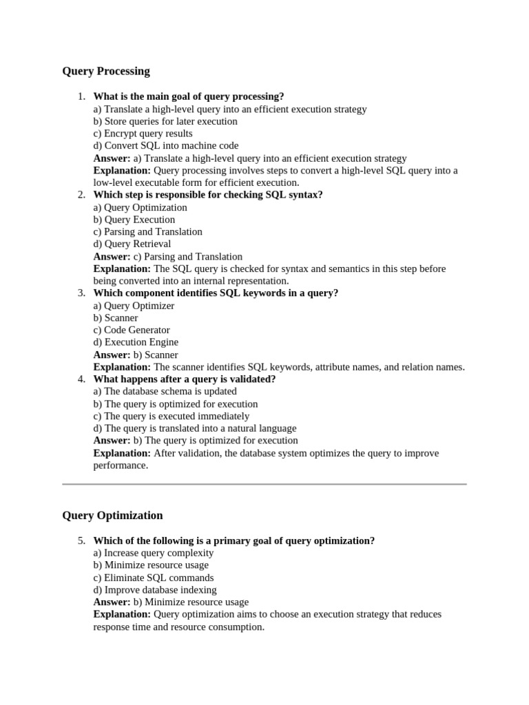 Explanation: Query processing involves steps to convert a high-level SQL query into a