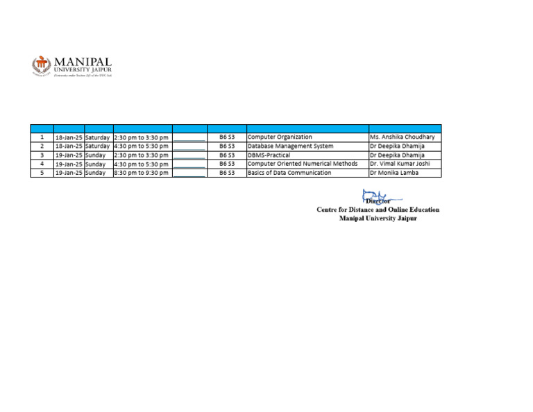 2 18-Jan-25 Saturday 4:30 pm to 5:30 pm Click Here B6 S3 Database Management System Dr Deepika Dhamija