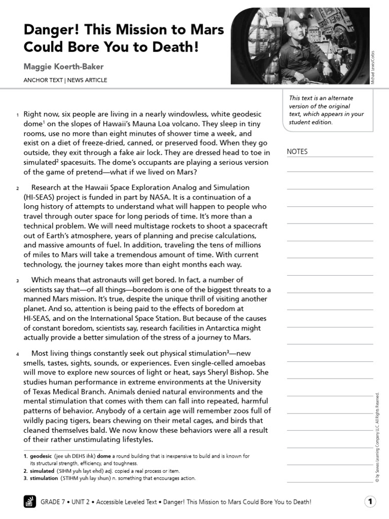 GRADE 7 • UNIT 2 • Accessible Leveled Text • Danger! This Mission to Mars Could Bore You to Death! 3